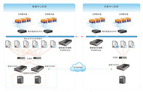 通過愛數容災網關實現存儲數據高可用與愛數備份存儲柜集中備份以及異地容災。本方案中通過整體解決方案可防范存儲單點故障風險,同時可防范數據丟失風險。通過備份容災網關還可以進行原有存儲的利舊應用。應用方案示意圖如下: